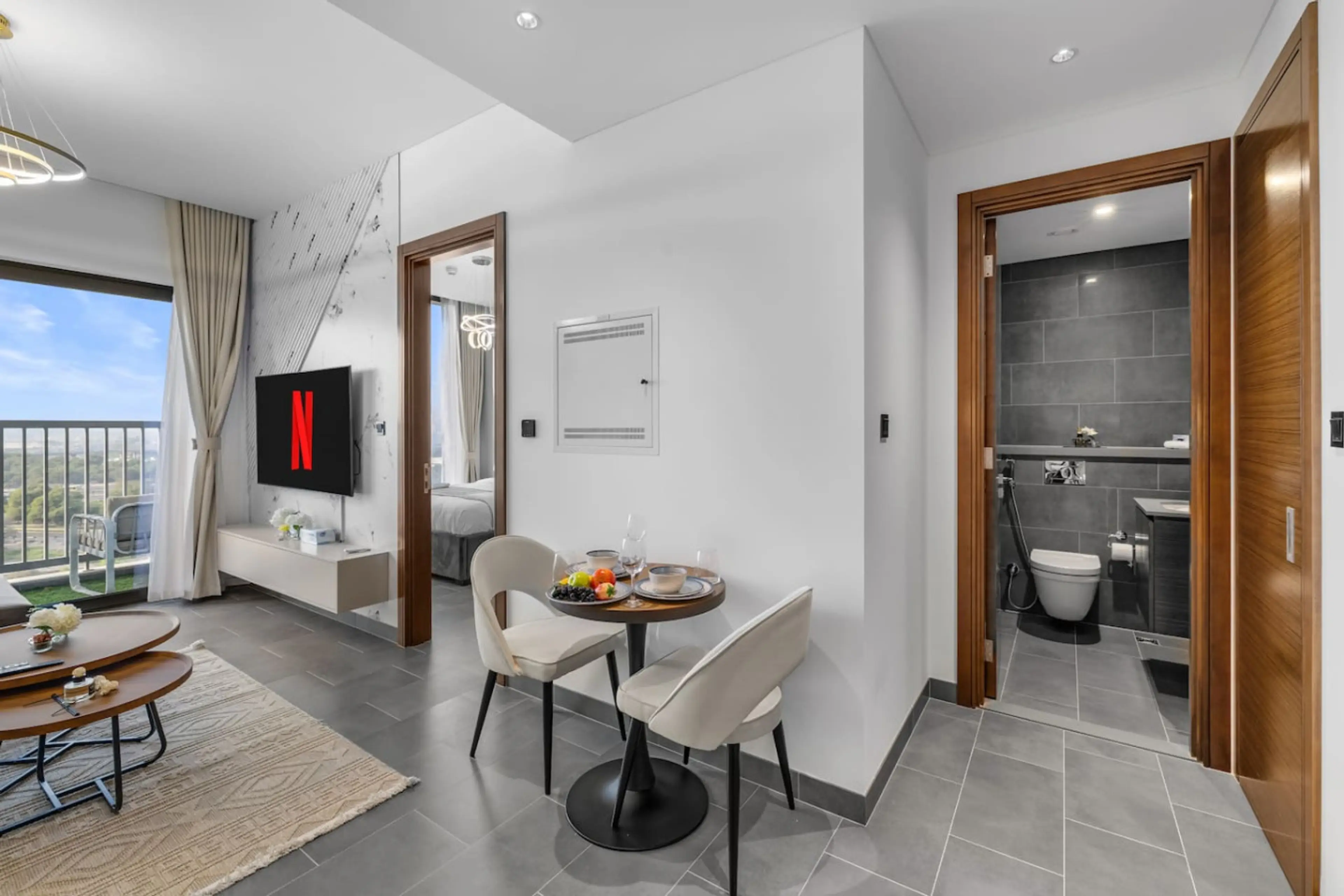 Step into comfort and elegance in this beautifully appointed one-bedroom apartment, perfect for solo traveller's or couples seeking a refined stay. The bedroom features a plush bed and a sleek attached bathroom, offering privacy and convenience. A separate powder room adds extra comfort for guests, ...